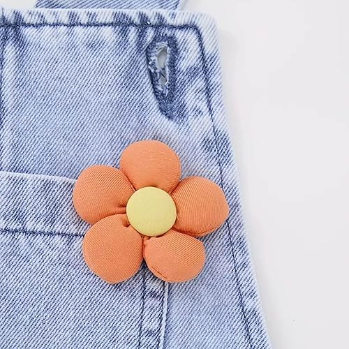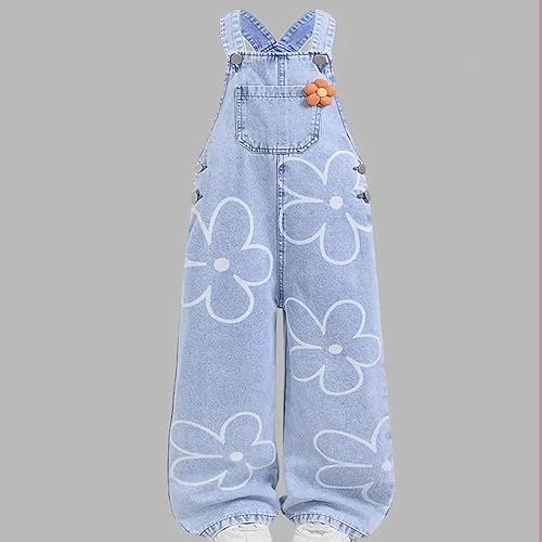 Features: Kids denim overall design with front pocket, wide shoulder straps and flower applique