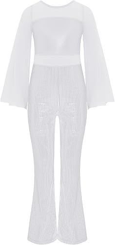 Kids Girls Disco Dance Outfit Sheer Mesh Patchwork Long Flared Sleeve Metallic Bell Bottom Jumpsuit Silver 16 Years