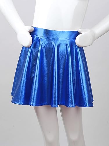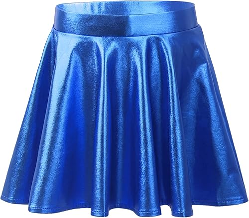 Flared circle cut with a high-rise, full elastic waistband for comfortable fit. Glossy metallic appearance
