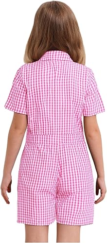 Kids Girls Lapel Collar Short Sleeve Plaid Jumpsuit School Uniform Casual Playsuit One Piece Summer Rompers(Pink,8 Years)
