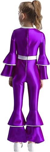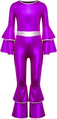 Kids Girls Metallic Gloss 70s Disco Jumpsuit Jazz Dance Outfits Long Sleeve Tiered Flared Jumpsuit(Purple,12 Years)