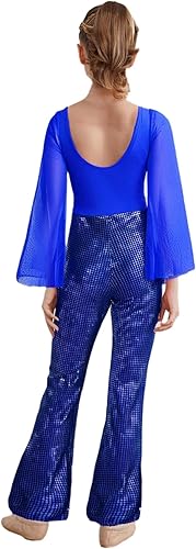Kids Girls Metallic Plaid Bell-Bottom Jumpsuit Full Body Long Flared Sleeve Mesh Patchwork Gymnastics Leotard Royal Blue 6 Years