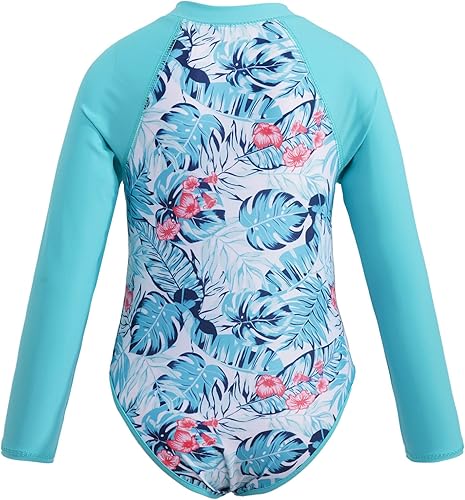 Long sleeves, swimsuit is printed with palm trees patterns. Front zipper closure for easy dressing. Zipper flap for protection.
