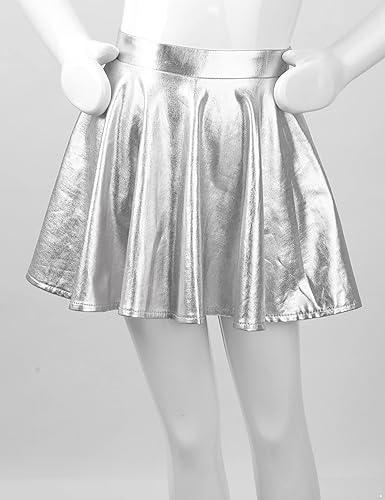 Flared circle cut with a high-rise, full elastic waistband for comfortable fit. Glossy metallic appearance