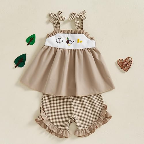 Cute Design: The girls’ camisole has tie-up shoulder straps, embroidery duck pattern, pair with a pair of ruffled plaid shorts; The summer girls clothes makes little girls fashionable and lovely