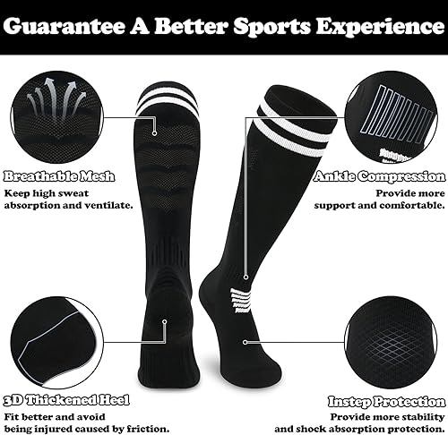PROFESSIONAL SPORTS MATERIALS & BREATHABLE MESH: Our kids soccer socks are made of premium polyester, which is super soft, comfy and durable. The toddler soccer socks added thickness on instep, toes and heel that can reduce impact or friction during actions to avoid injury and without worries of tearing easily. Besides, the breathable mesh of the youth soccer socks can enhance air circulation and reduce stuffiness effectively. Even if worn for all day, the feet and legs will remain dry and cool.