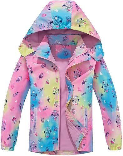 Care Instructions: Machine wash this girls rain jacket in cold water separately to preserve the cartoon prints and tie-dye colors. Tumble dry on low heat setting to maintain the waterproof quality. Avoid using bleach or harsh detergents that could affect the vibrant patterns. Store in a dry place when not in use to ensure long-lasting color intensity and performance.