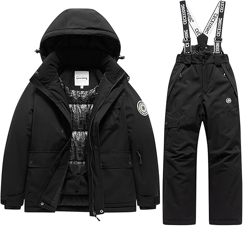 Kids Two Piece Snowsuits Thicken Warm Hooded Ski Jacket And Snow Overalls Boys Girls Outdoor Waterproof Windproof Suit(E-black,7-8 Years)