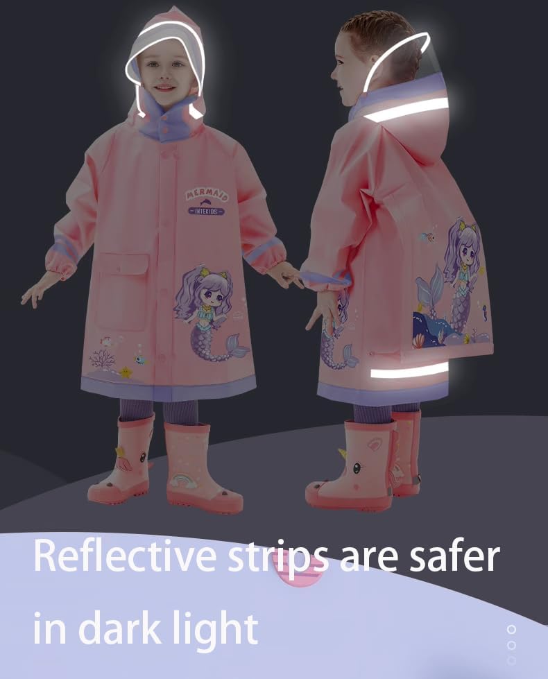 2-Piece matching rainwear set includes Kids Raincoat and matching Foldable Girls Umbrella featuring Unicorn and Mermaid character