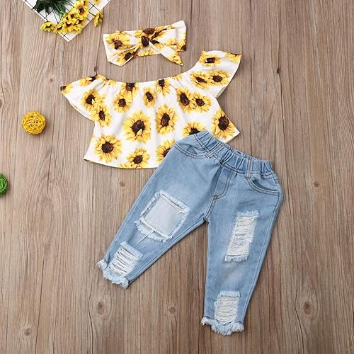 Leopard / Sunflower printed off-the-shoulder crop shirt tops ripped denim pants classic & fashion design to make this clothes set so adorable and cute for your princess.