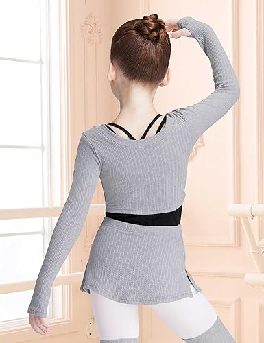 Crop Girls Ballet Sweater with Thumb Hole and Kintted Ballet Skirt Skort with Side Slit, and Above Leg Warmer. Very Fashion Set for Ballet Warm up in Winter
