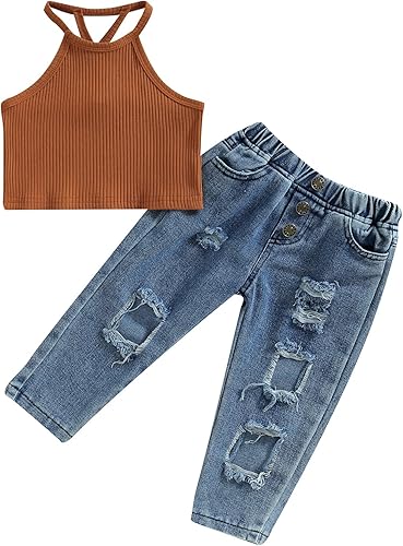 Design: The sleeveless camisole halter crop top has solid color, ribbed knit fabric, pair with a pair of elastic waist ripped jeans denim pant, the toddler girl summer outfit makes little girls more fashionable