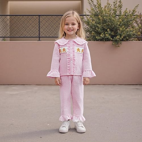 DESIGN: Two piece toddler pajamas,The pjs for girls comes with Christmas tree/candy cane/bow print,button down shirts and pajama bottoms pants,Chirtsmas pjs outfit,Tops uses doll collar, flare sleeve, long sleeve, button-down design; Elastic waist long pants, making your kids feel relax