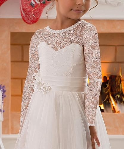EXQUISITE DESIGN: A beautiful baby flower girl dress with lace bodice, tulle skirt and long sleeve. The skirt is decorated with a satin bow and magnificent detachable lace train.