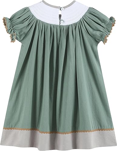 Boutique quality smocking and embroidery with details like rickrack wavy trim, covered buttons at the neckline and full lining