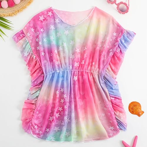 Toddler cover ups for swimwear: Beautiful mermaid scale pattern in purple and blue rainbow colors with delicate ruffle sleeve details for a magical beach look, making it a magical addition to any little girl's beachwear.