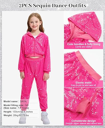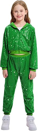 FASHIONABLE & FUNCTIONAL: This girls' hip-hop dance outfits ensemble features a long-sleeved cropped top with a front zipper closure, making it convenient to put on and take off. The matching sequin pants come with a comfortable cotton lining and an elastic waistband, ensuring both comfort and flexibility during performances