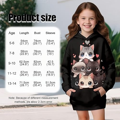Long Hoodie Sweatshirt with Pockets Casual Long Sleeve Hooded Pullover Loose Soft Tops for Girls Kids 5-14T(Black Cat,11-12 Years)