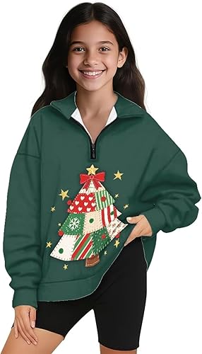 Long Sleeve Preppy Sweatshirts for Girls 5-14 Quarter Zip Stand Collar(Green Christmas Tree,13-14 Years)