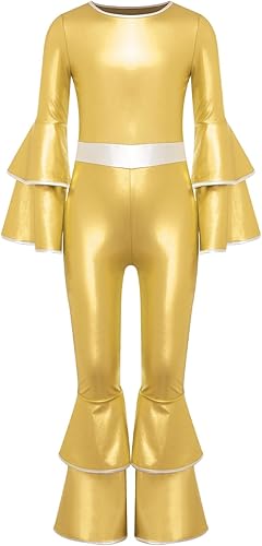 Loyan Kids Girl's Metallic Jumpsuit Sparkly Overalls Playsuit Flare Bell Bottom Pageant Party Romper Evening Gowns Gold 10 Years