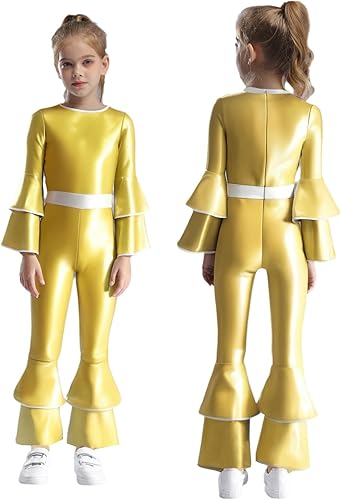 • 70s disco costume for girl, is designed with round neck, long sleeves, high waist, tiered flared detail, and back zipper closure