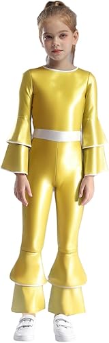 70s disco costume for girl, is designed with round neck, long sleeves, high waist, tiered flared detail, and back zipper closure