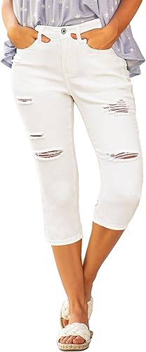 luvamia women's distressed denim capris features high waist design, zipper fly with a button closure, classic five-pockets, distressed design with ripped holes detailing.