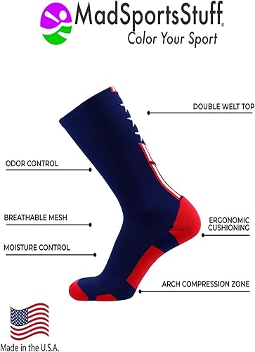 PERFECT SPORTS SOCKS: Show your USA Pride in these patriotic crew socks featuring stars and stripes inspired by the American flag. Ideal for lacrosse, basketball, volleyball, wrestling, football and more!