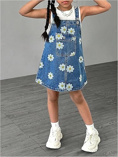 Features: Floral print, pocket, straight hem, mini length, going out denim dress for girls
