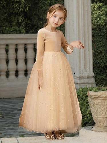 Elegant Velvet Flower Girl Tulle Dresses:A-line Tutu Dresses features long sleeve,A-line with back zipper, crew neck, floor length, high waist,sequins tulle makes your girl like a princess.Kids toddlers velvet dress for little or big girls.