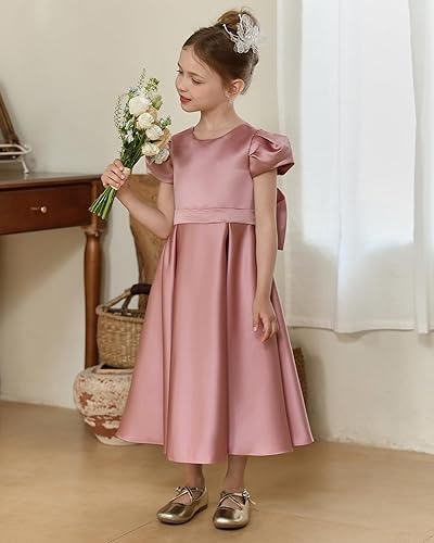 MCieloLuna satin flower girl dress for wedding, this toddlers girls princess dress features Tea length, glossy satin fabric, short sleeve, elegant girls holiday formal party gown, toddlers princess pageant dance gowns