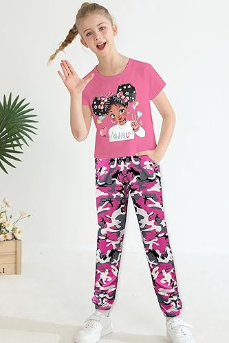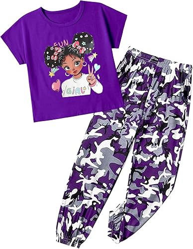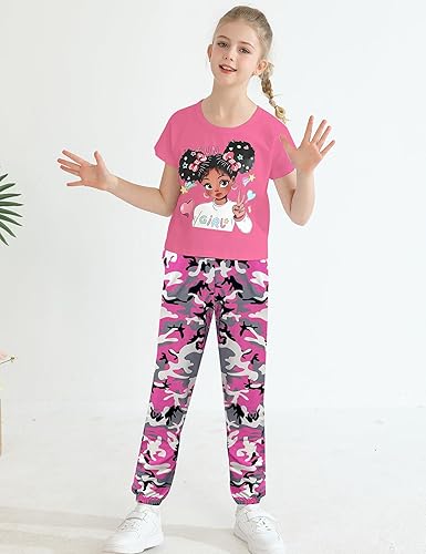 Features: Girls summer outfits sleeve , fashionable print, girls camouflage pants, elastic waistband, two side pockets, loose fit, comfortable and easy to wash and maintain, will not shrink and fade.The elastic waist on the camo pants ensures flexibility and ease