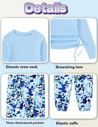 Design: Girls' clothing sets tops have ruched drawstring design and bow decoration on both sides. These details give the top a stylish touch; pants are used in popular camouflage printed, tightened pants feet, pockets, convenient and fashionable