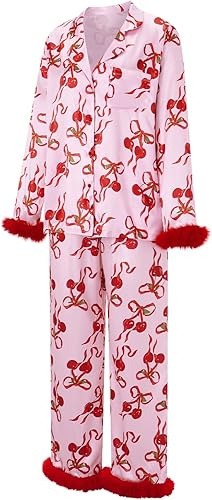 Features: Matching Valentine's pjs for mother daughter, cute print valentine's day pajamas set, 2 piece lounge set, relaxed fit,feather trim long sleeve shirt wide leg pants, white pink silk satin pajama pjs, Sweet heart silk pjs lounge sets for women
