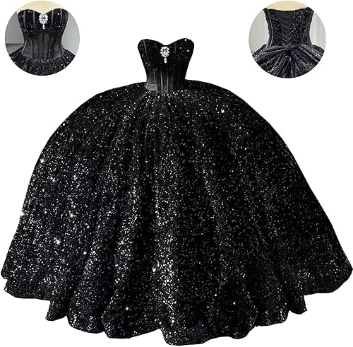 Features:Sparkly sequin quinceanera dresses, beaded prom dresses long ball gown with bow, rhinestone quince dress, strapless party evening gowns, sweetheart 16 dresses with train, glitter sixteen birthday dresses.