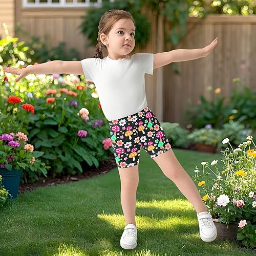 Mushroom Flower Black Girls Bike Shorts Toddler Soft Cotton Active Biker Shorts(Multi-mushroom Flower Black,10 Years)