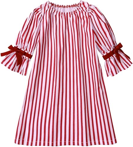 Little Girls PJS Set with Christmas Classic Red and White Stripe Elastic Crew Neck Tee Shirt Top for Easy Dressing, Ruffle Cuffs and Hem with Red Bow-knot Decorated, Very Cute.