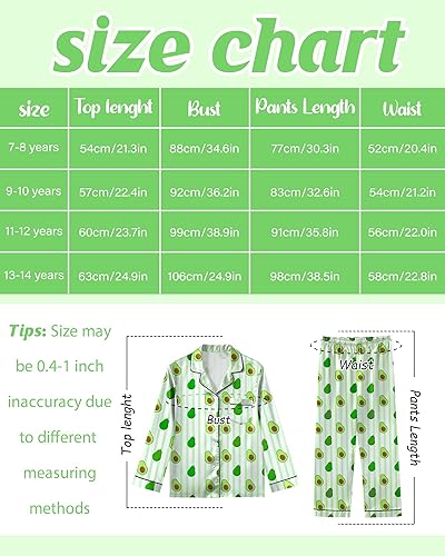 2 Pieces Girls' Pajama Sets: This girls' pajama sets are two piece pajamas matching with buttoned satin long-sleeved shirt top and a girls pajama pants with elastic waistband. Loose fit and Comfortable loungewear set for your kids. Our girls pjs cater to ages 7-14, available in 4 size to choose. Please consult the size chart to select the perfect fit for the best experience before making your purchase