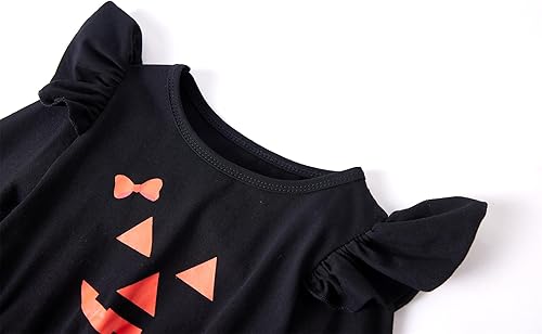 This girls' dress features an black bodice with long sleeve with ruffle shoulder detailing. A classic Halloween patterns, making it a staple addition to her holiday wear. The breathable fabric makes for cool and comfy wear, while the bow at waist adds a fun touch. She can pair this dress with a pair of booties for the perfect look!
