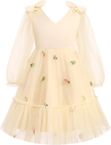 Cute Design: Sheer mesh long puff sleeve V neck top bodice, 3D cherry, heart or strawberry print with a huge bowknot at each shoulder, V-cut back with invisible zipper at back, convenient to wear, the skirt features multiple layers of tulle, creating a voluminous princess effect, suitable for formal occasions.