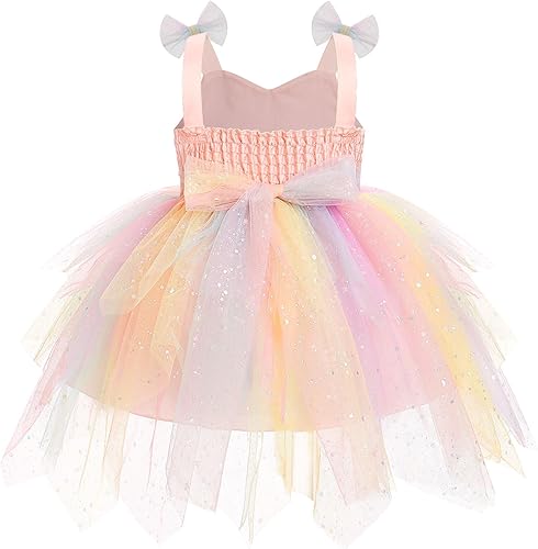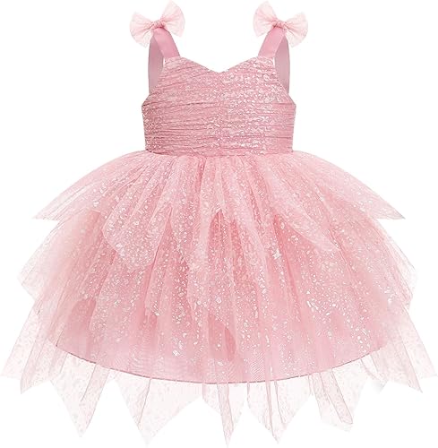 ADORABLE DESIGN - Super gorgeous formal dresses for girls. Sweetheart neckline cami dress, ruched mesh on the front bodice, a mesh bowknot on the each shoulder strap. High stretchy shirred back with self-tied sashes allow for a customized ease and fit to different body shapes. Fluffy handkerchief hem ruffle tulle skirt, including 4 layers of the skirt to add more fullness, 3 layers tulle with glitters and 1 layer lining, looks so pretty