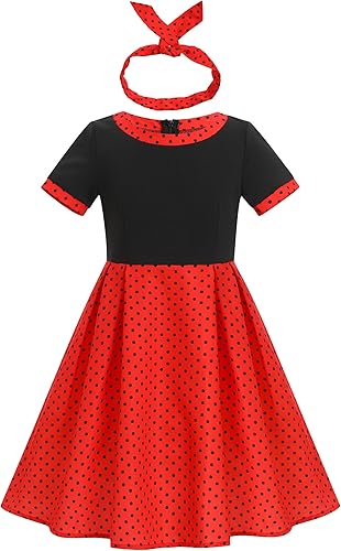 Package Include: 1PC Dress + 1PC Headband; Short Sleeve, Round Neck, Collect Waist, Polka Dot, Pleated, Hidden Back Zipper, Swing Style; Kids Girls 1950s Retro Vintage Dress Short Sleeve Polka Dot Swing Dress and Headband Party Dress