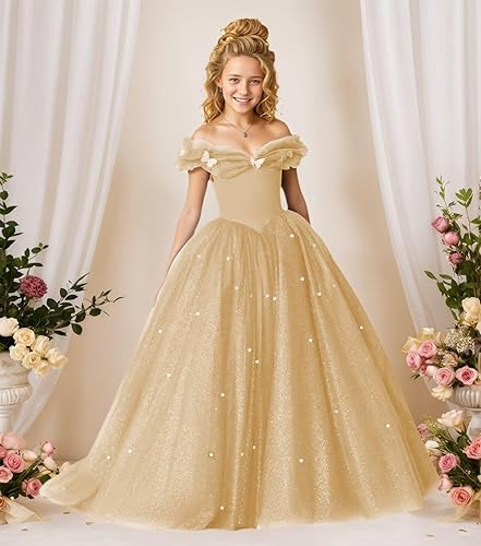 Material: Flower girl dress is made of sparkle tulle and satin,off shoulder neck,3D butterfly applique,high waist,pear beaded and zipper closure,comfortable and skin-friendly lining, ensuring little girls can move freely and feel comfortable throughout the day.