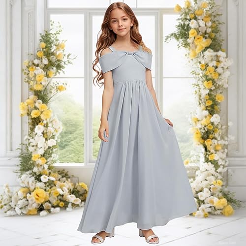 Features:Chiffon junior girls bridesmaid dress has an A-line cut, floor-length skirt and spaghetti straps.The off-shoulder detail and natural waistline make it a stylish choice for any formal or semi-formal occasion.ideal choice for any formal or semi-formal occasion