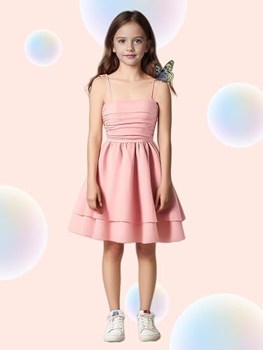 【Design】Girls flowy dress crafted with double layer ruffle hem and ruched bodice design, offering both a sophisticated and playful look, adjustable spaghetti strap and smocked back ensures a snug yet comfortable fit