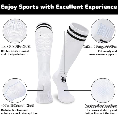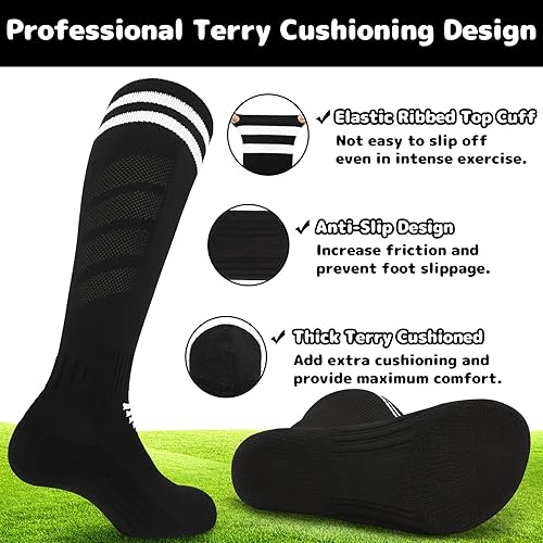 SUPER STRETCHY & MOISTURE WICKING: Our youth soccer socks are mainly made of premium polyester, which are ultra soft, skin-friendly and durable for exercise! Featured with superior elasticity, the kids soccer socks can not only fit tightly around the legs without extra pressure, but also easily pair with shin guards and stay in place while moving freely. Due to the moisture-wicking fabric, these boys soccer socks can effectively absorb sweat, keeping feet dry and comfortable throughout games!