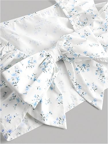 Features: Ditsy floral print, square neck, bowknot back decor, crop top, high-waisted, tiered layer, ruffle short skirt, 2-piece skirt set