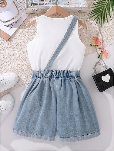 Features: 2 piece outfits, sleeveless, crew neck, tank top, elastic waist, asymmetrical trim, jean shorts