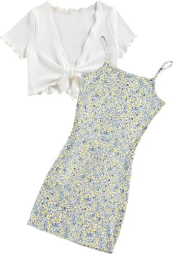 Design: Lettuce Trim, Rib Knit, Tie Front, Ditsy Floral Print, Short Sleeve, Casual, Cute