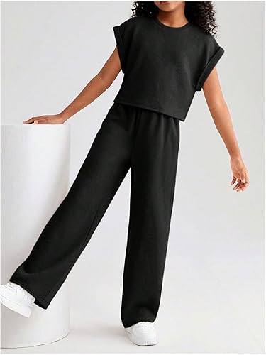 Features: Roll-up sleeve, cap sleeve, crew neck, solid color, elastic waist, long pants, 2-piece rib knit pants set